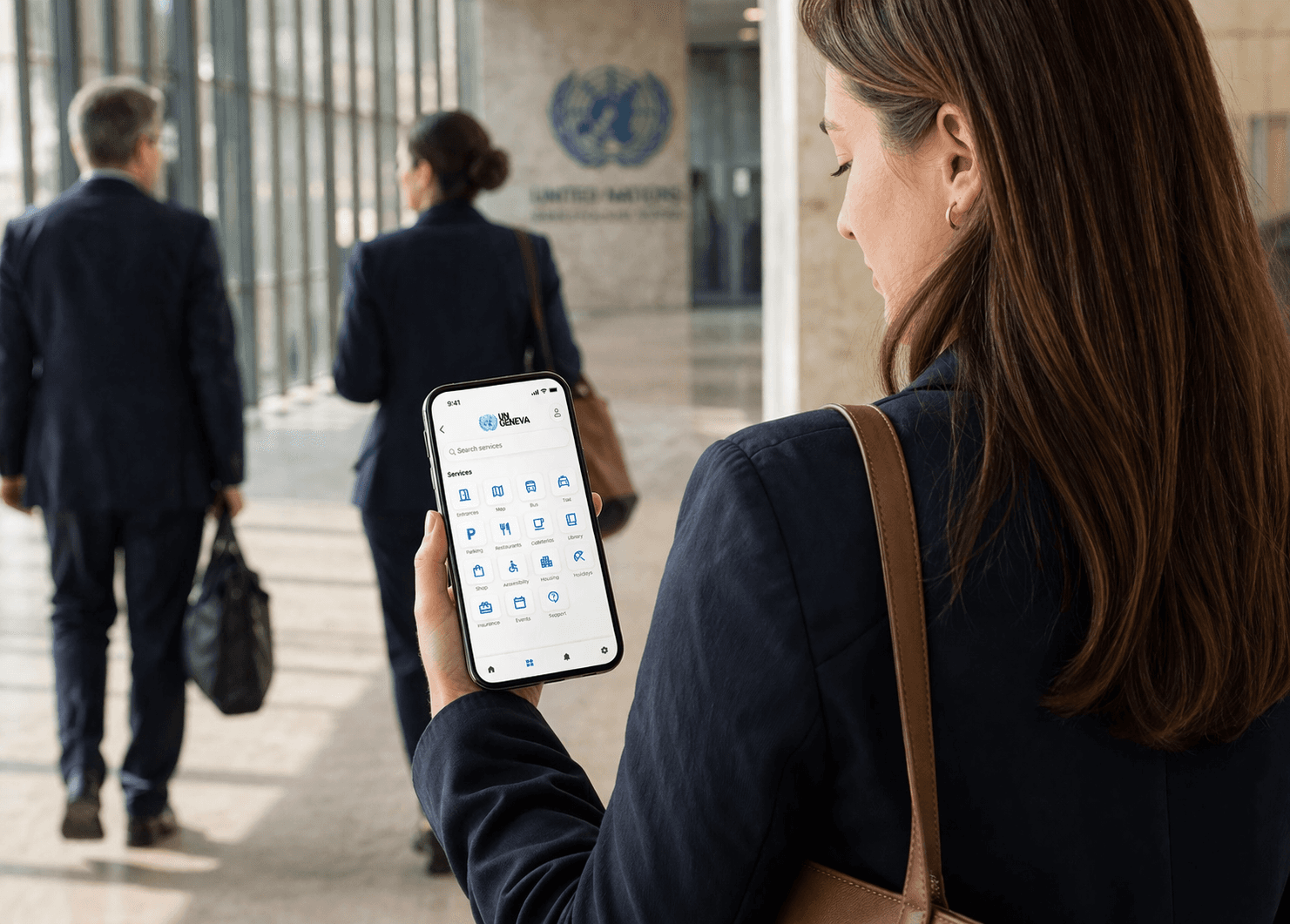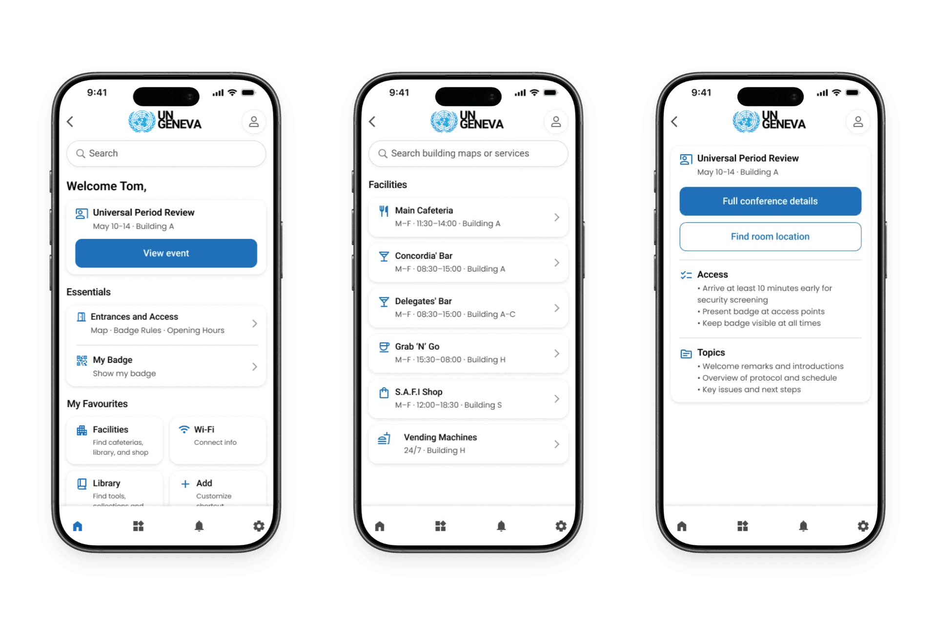 The vision was to create a unified mobile entry point that gives different UNOG user groups clearer access to essential tools, trusted resources, onboarding information, security alerts, badge and campus access information, and practical guidance for navigating gates, meeting rooms, and buildings more easily. Rather than replacing existing systems, the product was designed to bring more structure, clarity, and consistency to a fragmented internal ecosystem.